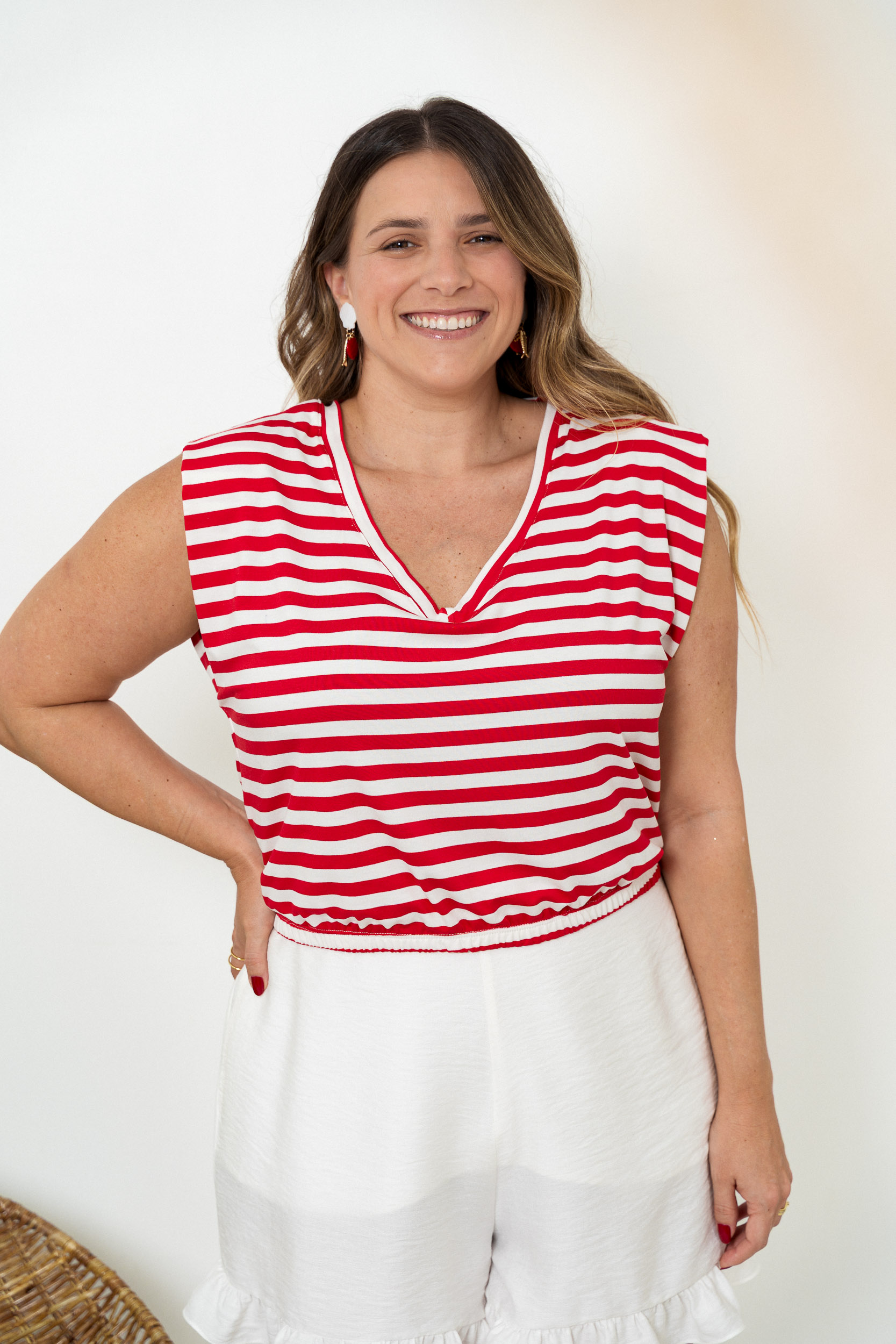 Essa blusa estilo muscle tee é aquela que você não vai querer perder! Além de ser super básica, com a padroanagem listrada vermelha e off atemporal, ela tem uma malha deliciosa e uma modelagem moderna! Aquela básica que te tira do óbvio, te deixando super estilosa!